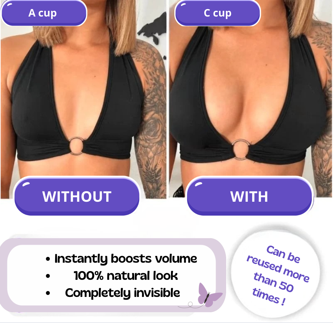 Make sure your skin is clean, dry, and free of lotion. Remove the protective film, then place the pads directly on your chest, adjusting their position for the desired effect (lift, shape, etc.). They can add up to 2 cup sizes. Gently press for perfect adhesion. After use, remove them carefully, rinse with lukewarm water, and let them air dry before reapplying the protective film.